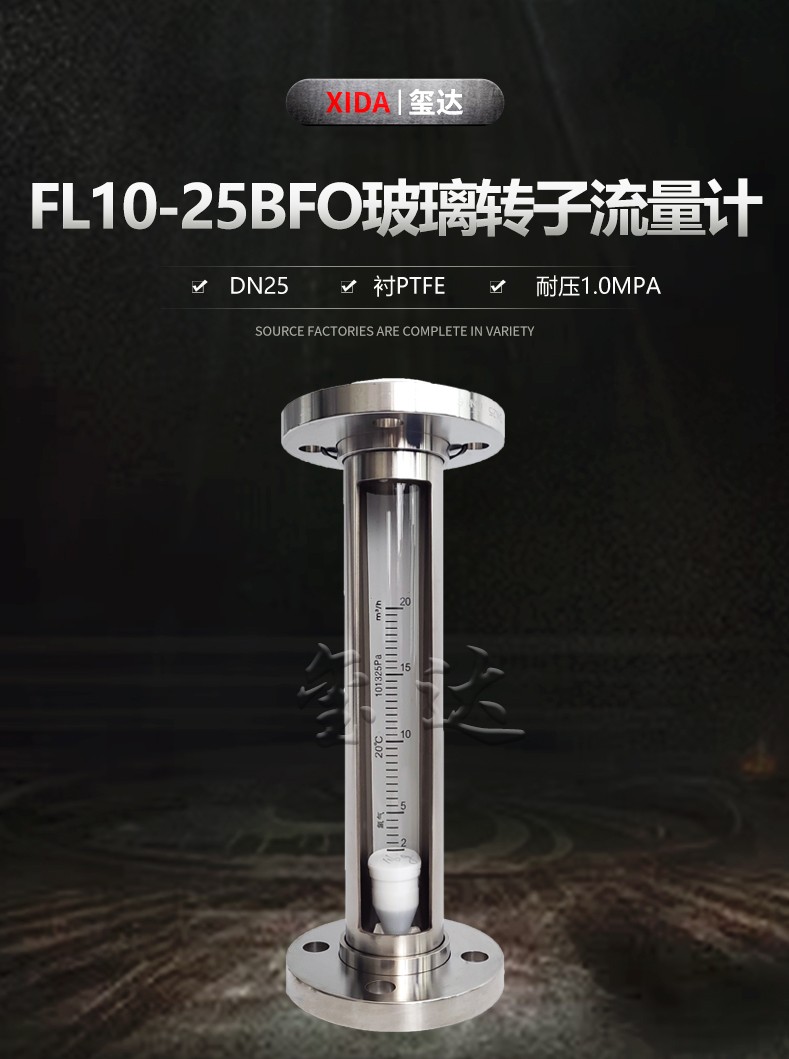 玺达仪表生产的FL10-25BFO衬四氟玻璃转子流量计是DN25法兰304不锈钢材质,接液PTFE,可测量液体或气体。。如:氮气氧气氢气甲醇乙醇酒精硫酸盐酸等,都可以使用这款浮球流量计。