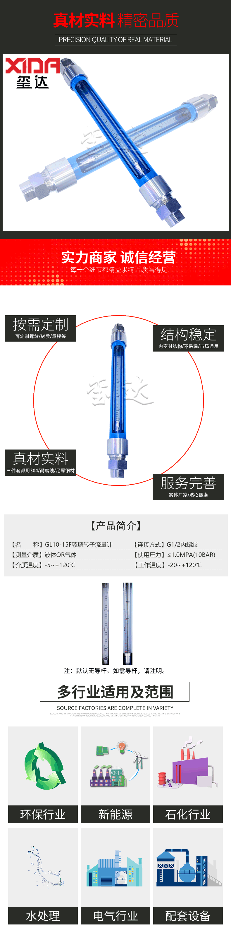 GL10-15F玻璃转子流量计可以测量瞬间流量,无需通电。此款流量计结构简单,价格优廉。这款是耐腐蚀的流量计,我们将其压螺母调整为六角压螺母,并且为了整体美观性,采用304材质。既满足了客户使用的方便性,又达到了整体美观性。我们拥有专业的标定设备,机械加工设备,实体工厂。