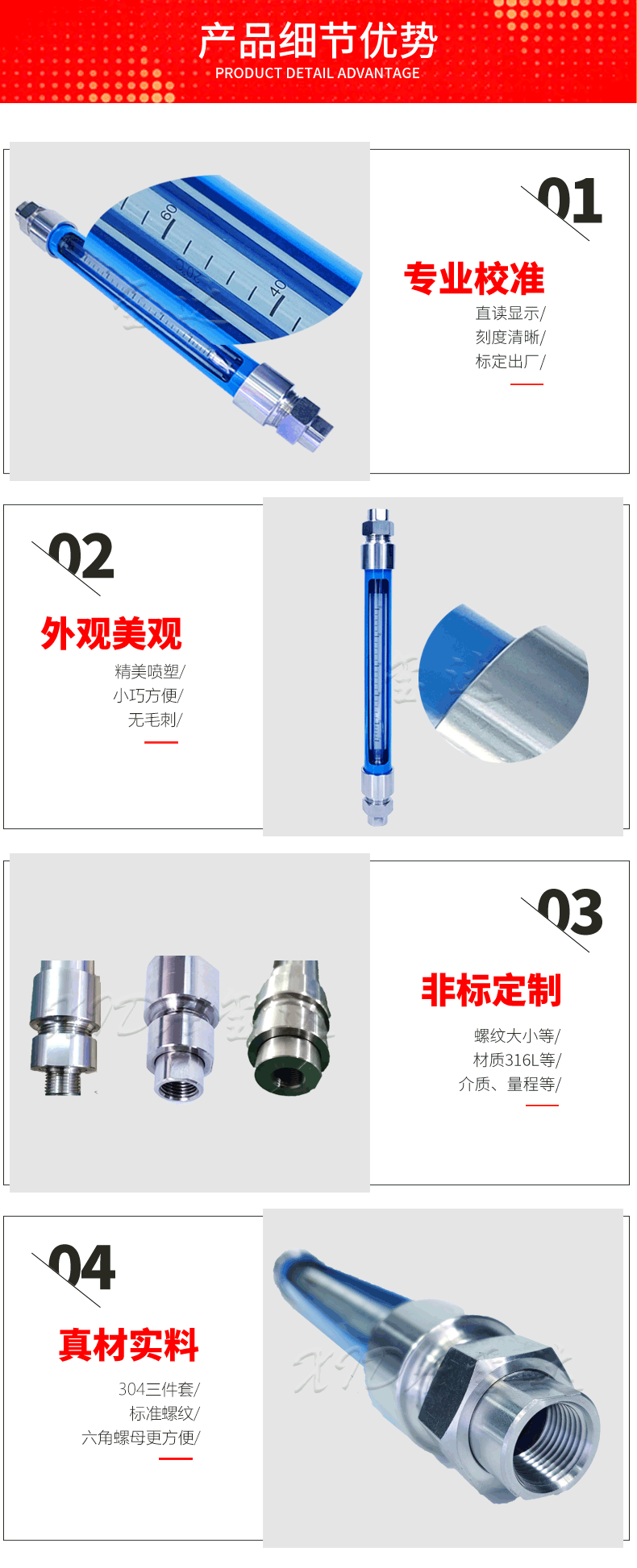 1. 优点:本款流量计精美喷塑,刻度清晰,耐腐蚀,内密封结构,标定出厂,一件起售。