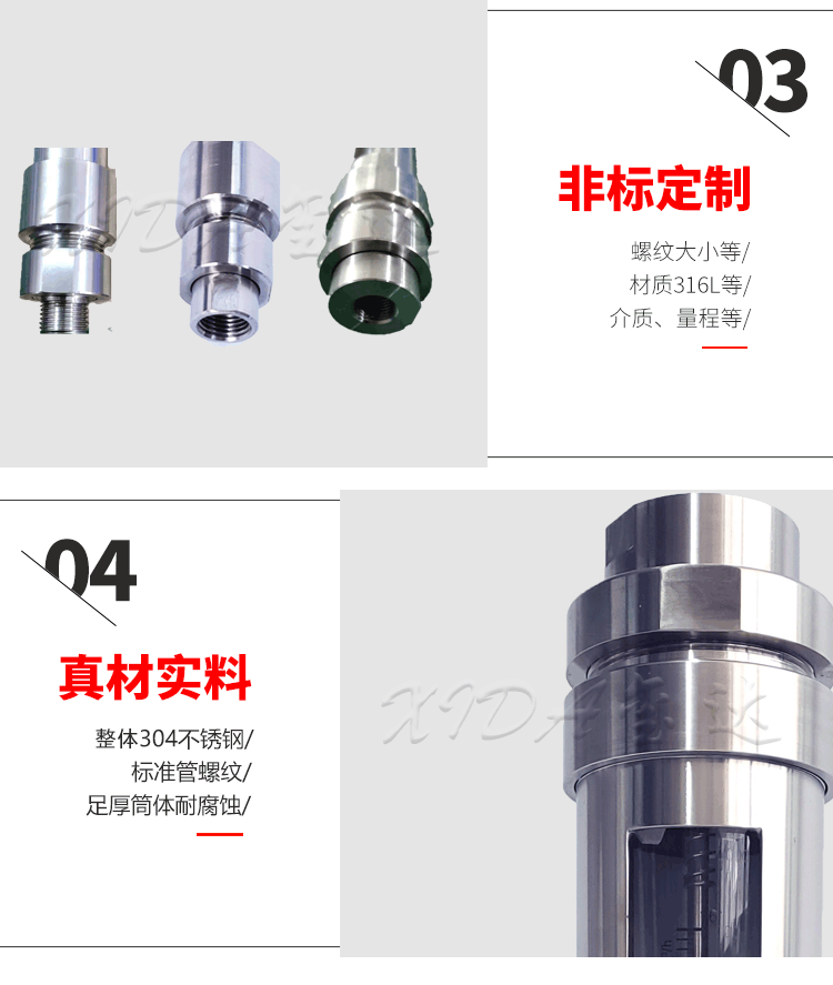 3. 外形:玺达仪表采用整体304不锈钢,标准螺纹,适用水,气等设备,真材实料,足厚足料。