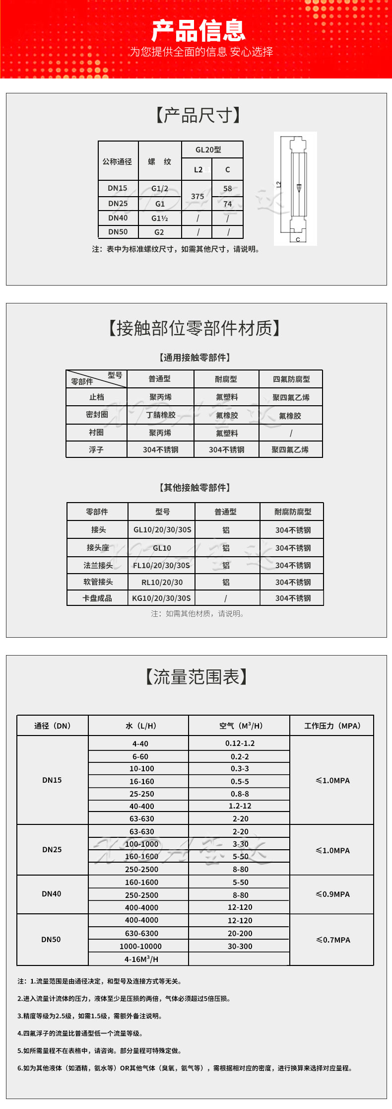 2.性能:GL20-25F玻璃转子流量计采用G1管螺纹,工作压力可达1.0MPa,螺纹连接,接液部位不锈钢。
