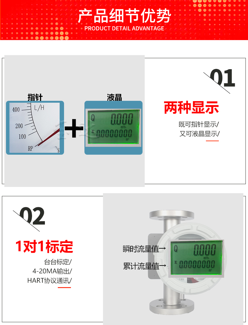 浮子内嵌一根磁钢,指示器中有磁耦合系统与之形成磁关联,当浮子在测量管中上下移动时,指示器中的磁耦合系统会带动指针移动。利用磁传感器检测位移并转换成电信号,经电路板处理后显示瞬时和累计流量,指针在指示盘上指示瞬时流量。
